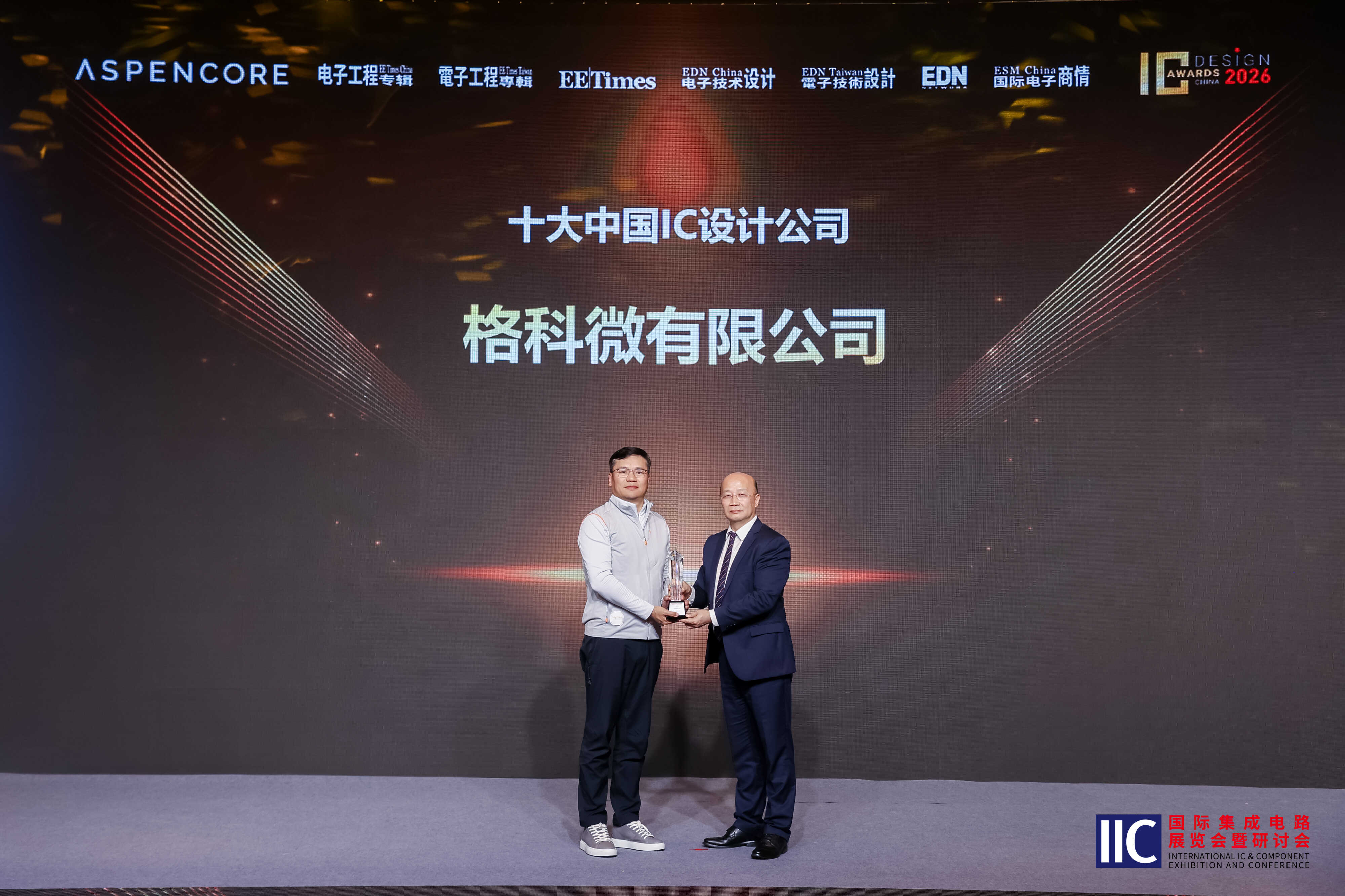 2026年3月31日,全球知名电子行业媒体集团 AspenCore 于 2026 国际集成电路展览会暨研讨会(IIC SHANGHAI 2026)期间,正式公布2026 年度 “中国 IC 设计成就奖” 获奖名单及《China Fabless 100》排行榜。格科凭借综合实力,蝉联“十大中国 IC 设计公司” ,并入选 “TOP10 传感器公司” 榜单。